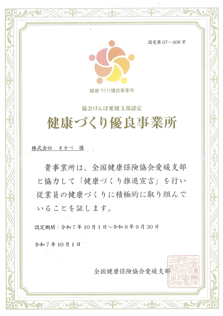 健康づくり優良事業所 認定 2025年10月16日 株式会社オカベは、全国健康保険協会愛媛支部様より、健康づくり優良事業所に認定をしていただきました。 認定第07-408号 « メディア掲載について(日本全国お取り寄せ手帖様)